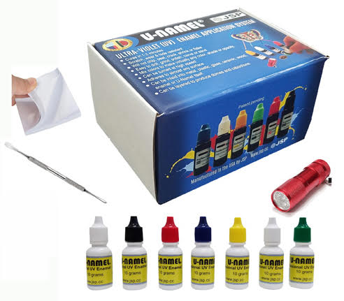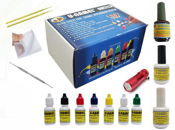 Deluxe Professional Kit: Contains 7 colors (red, blue, yellow, black, clear, white and green), a 9 led UV curing lamp, base primer, gloss liquid, mixing spatula and pads, application brushes and instructions.