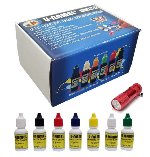 Premier Kit: Contains 7 colors (red, blue, yellow, black, clear, white and green), a 9 led UV curing lamp, application brushes and instructions.